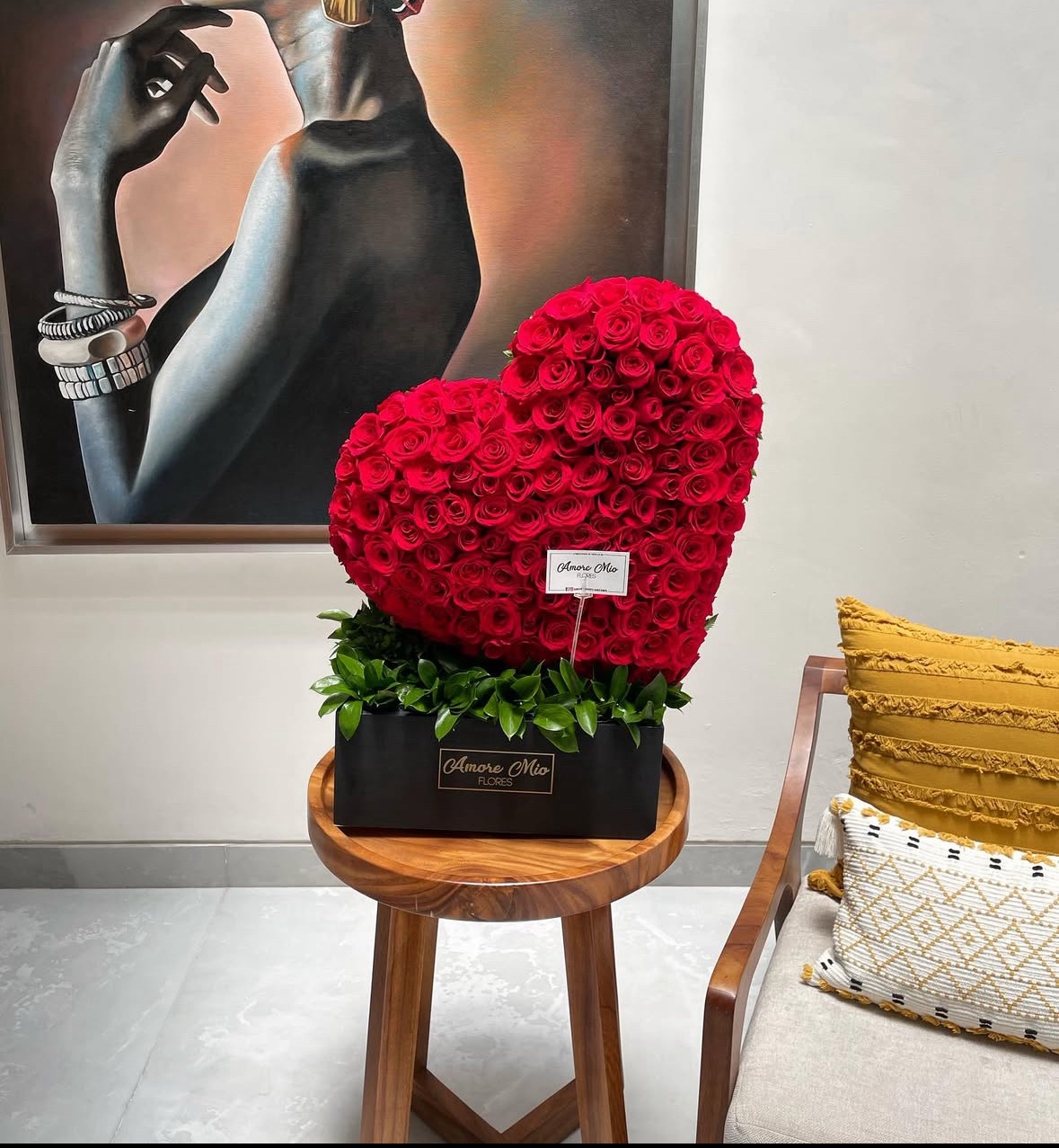 Escultura en forma de corazón con 170 rosas aproximadamente y follaje fino en caja negra.