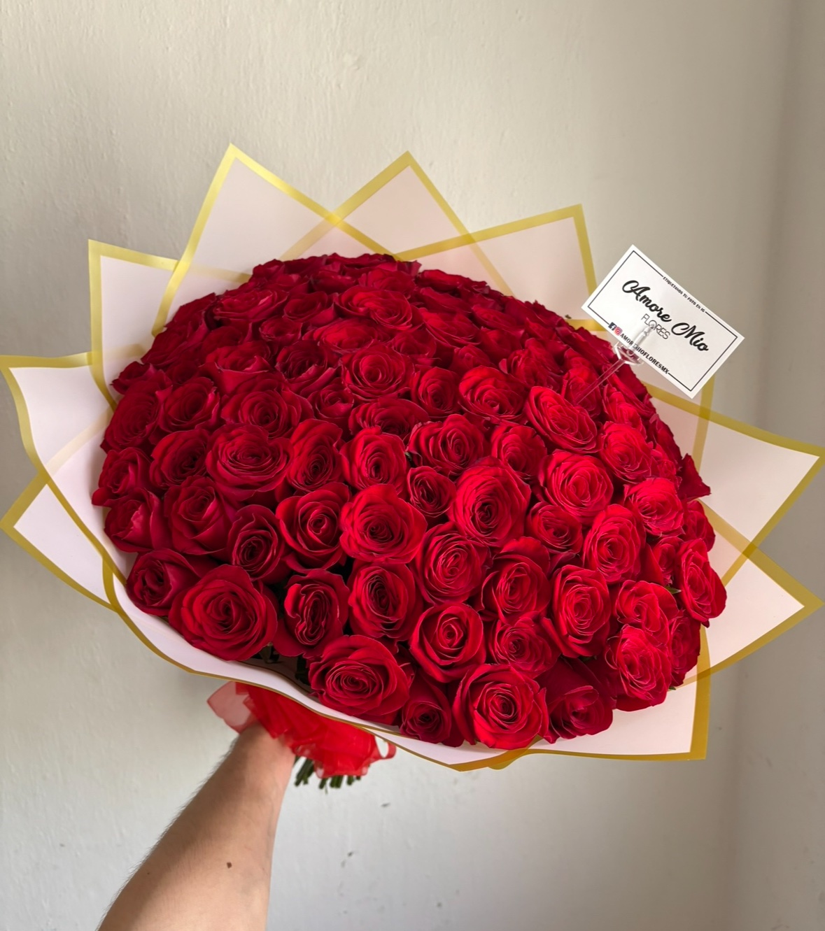 Ramo con 100 rosas rojas en envoltura de picos con filo dorado y moño de organza rojo.