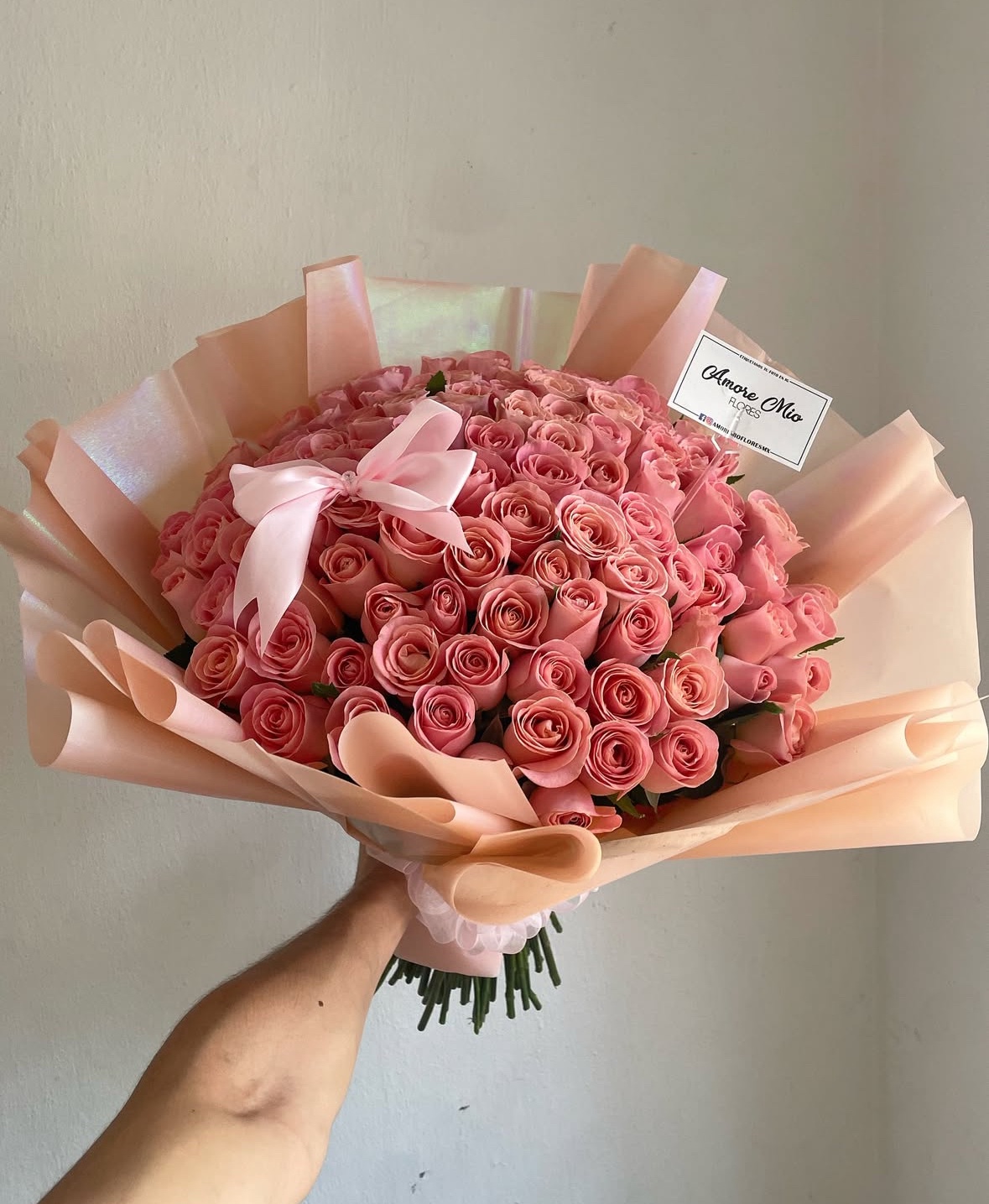 100 rosas rositas con envoltura rosita y moño rosita.