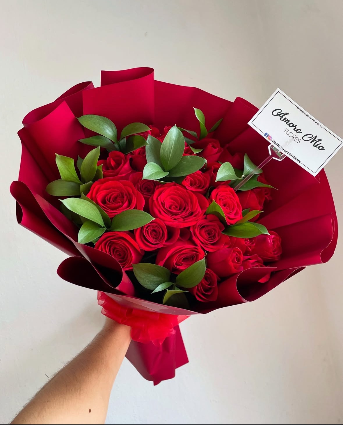Ramo con 24 rosas rojas y follaje fino envuelto en papel tinto y moño de organza.