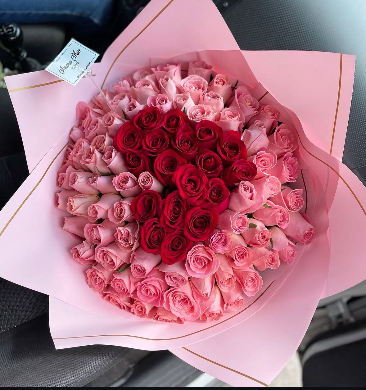 Ramo de 100 rosas color rosa con corazón rojo al centro envuelto en papel rosa en forma de picos y moño de organza rosa.