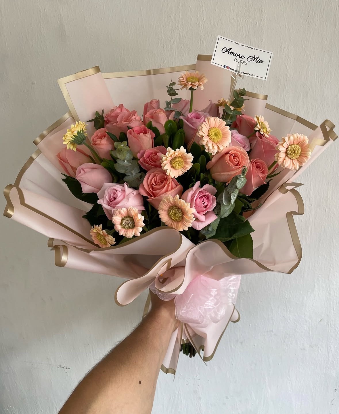 Ramo con 24 rosas color rosa, 10 mini gerberas rositas y follaje dolar envuelto en papel rosa elegante y moño de organza rosa.
