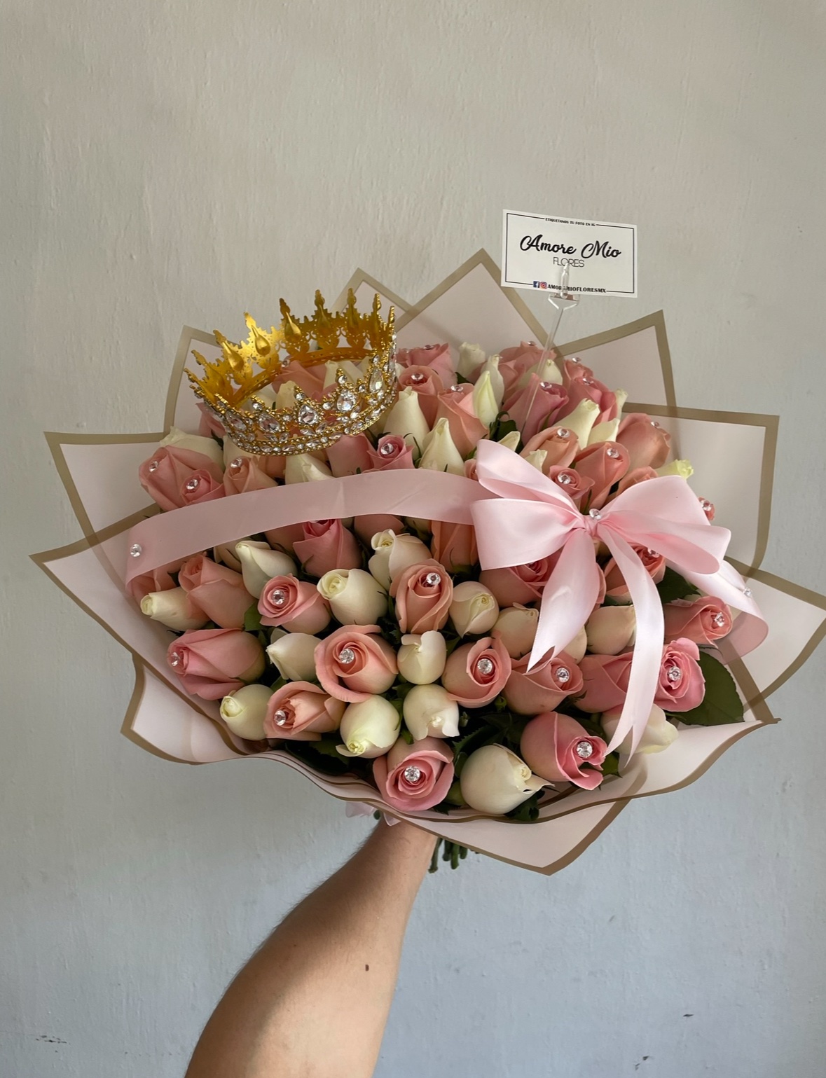 Ramo con 50 rosas blancas y rositas con una corona grande, pines de diamante y moño de listón satinado, envuelto en papel rosa en picos y moño de organza rosa.