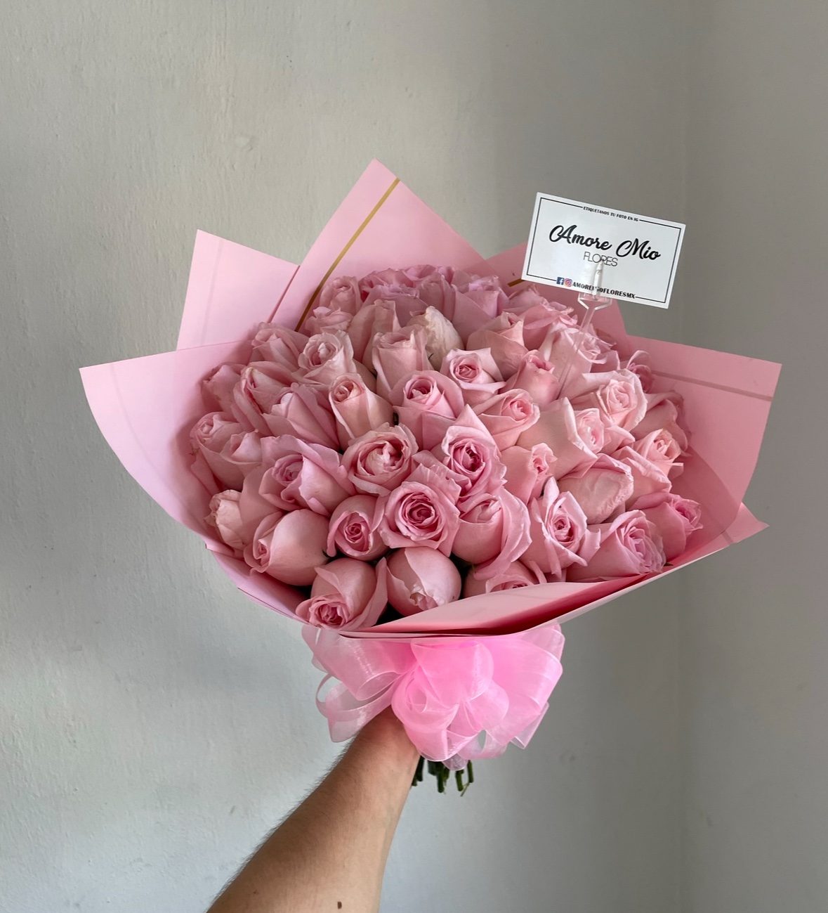 Ramo con 50 rosas rositas envuelto en papel rosa y moño de organza rosa.