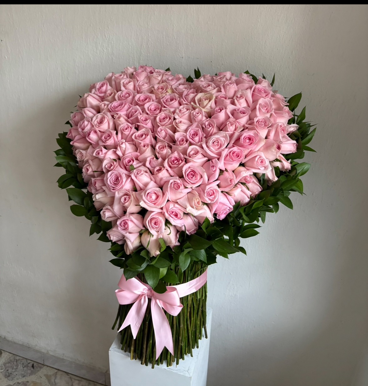 Arreglo florar con 170 rosas color rosa que simula ser un ramo. OJO no es un ramo, está montado sobre una base de madera para poder colocarlo en cualquier lugar sin florero .
