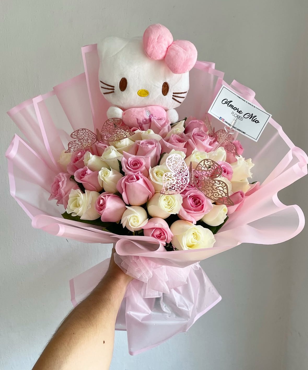 Contiene 50 rosas colores rosa y blanco, peluche de hello kitty y mariposas envuelto en papel rosa y moño de organza.